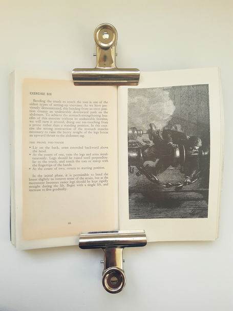 Livre hybride composĂ© de 2 ouvrages diffĂ©rents : Le tour du monde en 80 jours, Jules Verne (structure du livre, texte et gravures) / Isometric and isotonic exercises for men and women, I. G. Edmonds (photographies).